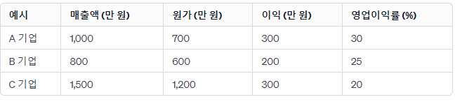 위 표는 A, B, C 기업의 예시를 보여줍니다. 각 기업의 매출액, 원가, 이익을 기반으로 영업이익률을 계산하였습니다. 이를 통해 A 기업이 가장 높은 영업이익률을 가지고 있으며, C 기업이 가장 낮은 영업이익률을 가지고 있다는 것을 알 수 있습니다.